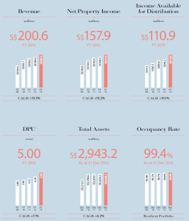 Based on 2013 AR, Wisma and Ngee Ann City contribute 67% of NPI, while Lot 10 and Star Gallery in KL contribute 15%. David Jones and Plaza Arcade in Australia contribute 10%, Renhe Spring Zhongbei in Chengdu contribute 5% and Japan properties 2%.