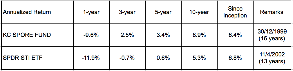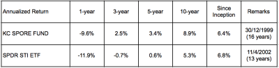 Back to last year performance. My portfolio did not escape the drop that the general market suffered. There was a 9.6% decrease in portfolio value over the year. Slightly better than the benchmark of SPDR STI ETF which dropped by 11.9%. I am glad it performed much better over a 10-year period.