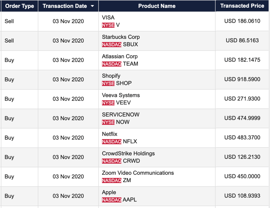 Near the end of October and early November, I trimmed my position of ADBE, SBUX and VISA to raise more cash to buy into other US counters. Made a 26% profit for ADBE and paid transaction fees for SBUX and VISA.
