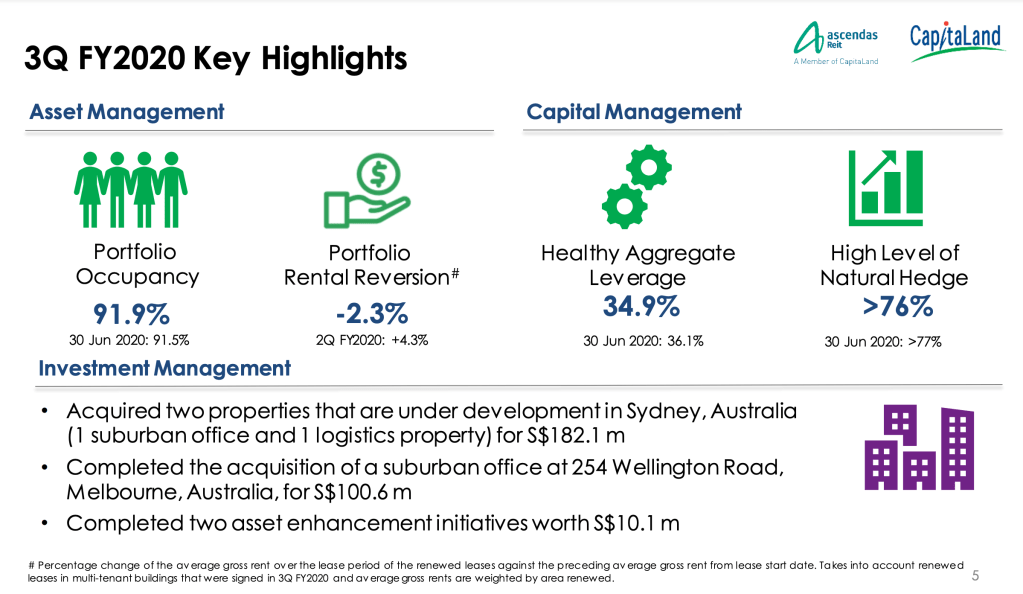 The slide above shows the key highlights of Ascendas Reit Q3 update. The positives are the slight increase in portfolio occupancy and lower leverage and of course the negative is the drop in rental reversion. I am confident it can maintain its 1H dividend of 7.27 cents and that will give it a current yield of 4.6%.