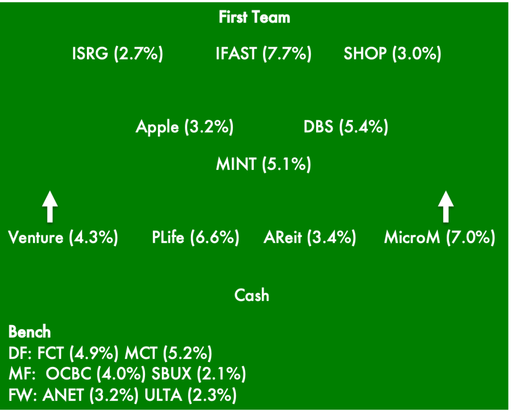 First team made up 70% of my portfolio which is 4% higher than the previous quarter. This is attributed to the strong performance from IFAST, Micro-Mechanics and Parkwaylife.