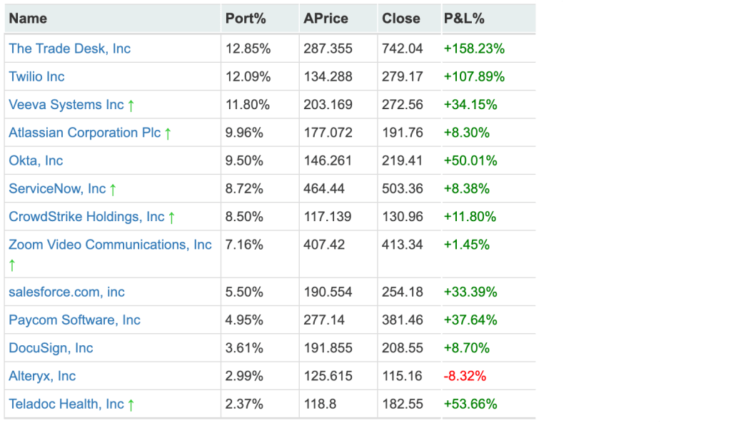 Since the May update, the team size has grown from 8 to 13. With its superb form, I have promoted Shopify to the main team in August and I parted way with Mongodb as I needed to raise cash to purchase the new players. Alteryx, Atlassian, CrowdStrike, DocuSign, Paycom, ServiceNow and Teladoc (from merger with Livongo) are the 7 players who joined the team.