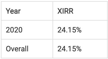 The goal is to get at least 8% compounded annual return over a 5-year period, with the stretched goal at 12%. Hence at the end of 2024, my portfolio should be up by at least 47% and 76% respectively. I am pleased that just one fifth into the race, the portfolio is up by 23%. XIRR is pretty similar at 24%.