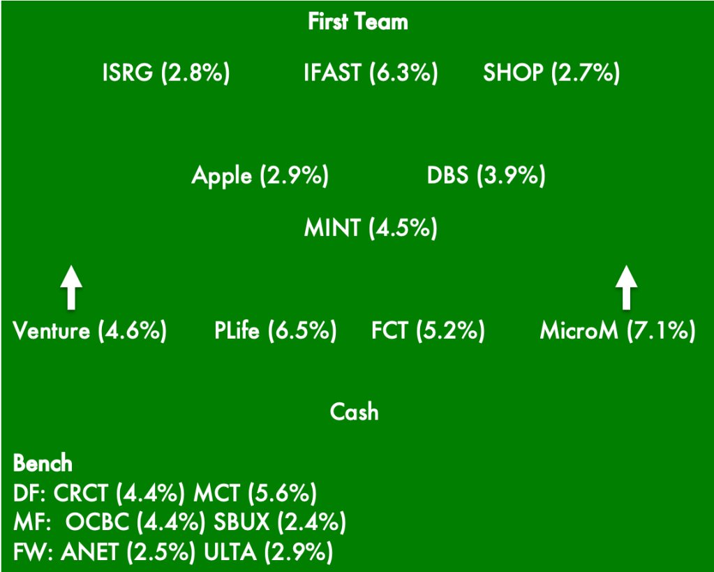 The positions depend on my intent when I bought them. So I bought UMS for its consistent dividend and you are right, I will probably play him as winger (similar role to micromechanics and venture). As for raffles, bought it for its expansion into China. So it is a long term growth story. Can prob be a defensive midfielder.