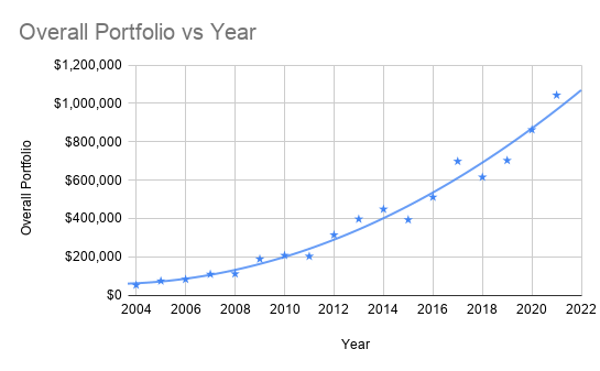 While I started the journey as early as 2000, the first few years I was lost sheep and can be truly forgotten. Decided to show the data from 2004 as it is an easy reference point for me – I was 30 then and total investment was around 50k.