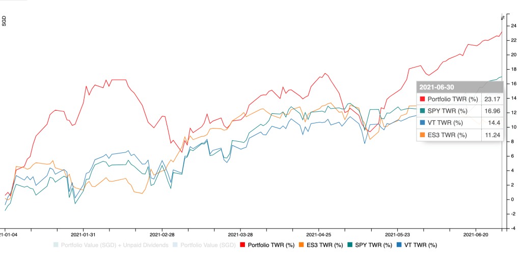 In fact, my US portfolio was still lagging SPY by a whooping 14% on 16 June. However, 2 days later on 18 June, the gap was reduced to 1.5%, and now I am level. I would never have caught this movement, so staying in the market works well for me.