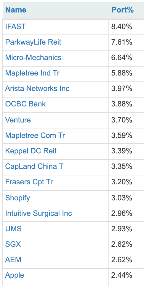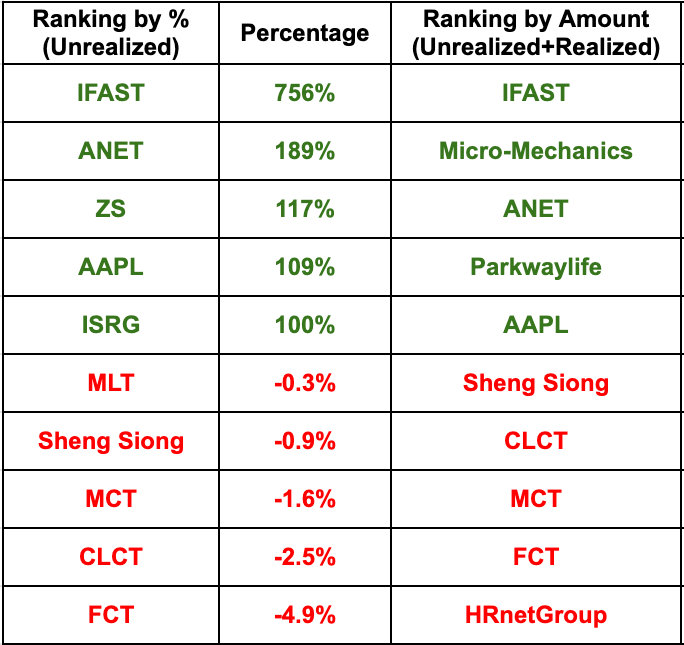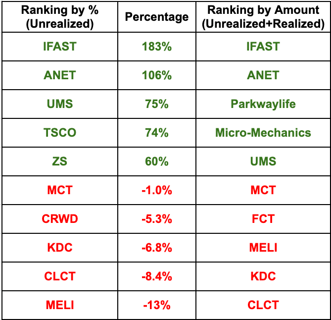 For the second year in a row, iFAST tops the chart in percentage and amount. I am expecting a weaker growth in the next two years, so its price might fall for 2022. Nonetheless, with the expected jump in both top and bottom lines from 2024, I am holding to my current holdings. With strong guidance from Arista Networks in the latest quarter and knowing both MSFT and META are investing as they move into metaverse, it should remain as a strong contender for top five next year too. I am also expecting UMS, Micro-Mechanics and AEM (7th this year) to continue to benefit from semi-conductor tailwind. Cybersecurity leader Zscaler will be in the race too with the continued adoption of tech worldwide. Tractor Supply is the black horse for this year. I have bought this rural lifestyle retailer for moderate growth but it has outperformed both in its business growth and share price.