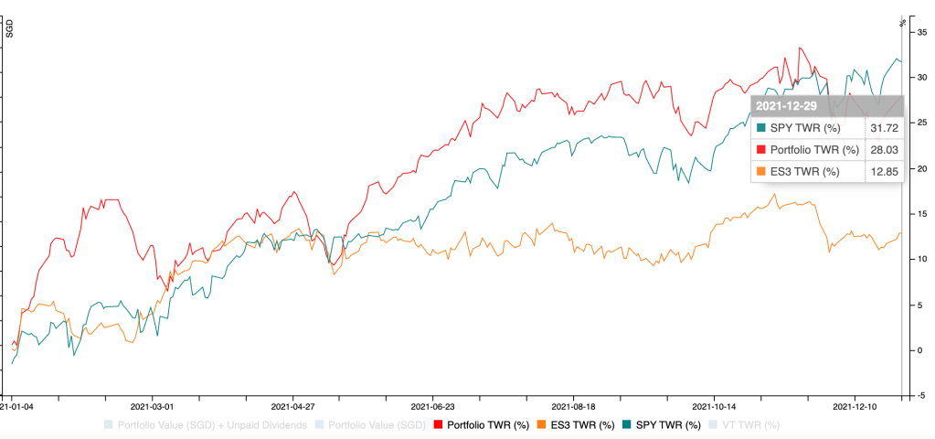 If last year’s 23% return was unexpected, this year’s return of 28% is unbelievable. It’s not that I have not achieved such return before but with a larger and more diversified portfolio, I wasn’t expecting such good return and this is achieved after the carnage from mid-November. All time high from the portfolio this year was 33%, recorded on 18 November but since then my US portfolio, which is skewed towards high growth tech counters, have dropped by more than 10%. The drop in SPY was less, allowing it to overtake my portfolio in this final stretch.