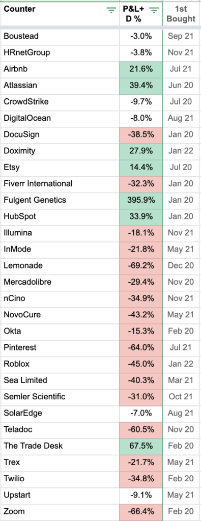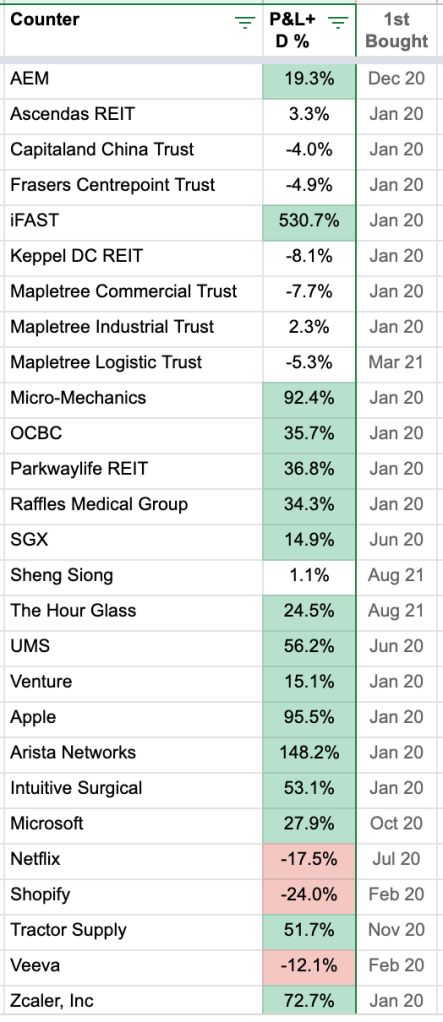 The first image shows the average performance of my top 27 counters by position (85% of portfolio) since I first bought them. As seen from the number, they have done reasonably well despite the current blood shed. With NFLX and SHOP being whacked recently, they have registered double digits loss. However their impact on the portfolio is limited. On a side note, my conviction on SHOP is still high and will continue to hold on to my stake.