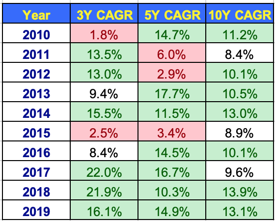 Obviously, two factors that affect the above would be the average return of investment and annual expenses. The images below shows the running 3-year, 5-year and 10-year compounded return over the period from 2009 to 2019 for both cash (left) and CPF (right) portfolios.