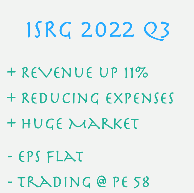 ISRG Q3 revenue is up by 11% to $1.56b with flat non-GAAP EPS of $1.19 and GAAP EPS down by 15% at $0.90. Given that the share is trading at a hefty PE of 58, the numbers do not look impressive. However, to achieve the above under the current the macro headwinds, it is not too bad. What caught my attention is that they are growing in various procedures and there seem to be good potential of the new ION system. They also seem to be doing well in various regions which is crucial in their next growth phase as only 20% of their revenue is currently coming from outside US. The company has indicated a slower operating spending from 2023 which means that if they can sustain their revenue growth, then EPS will get a boost!