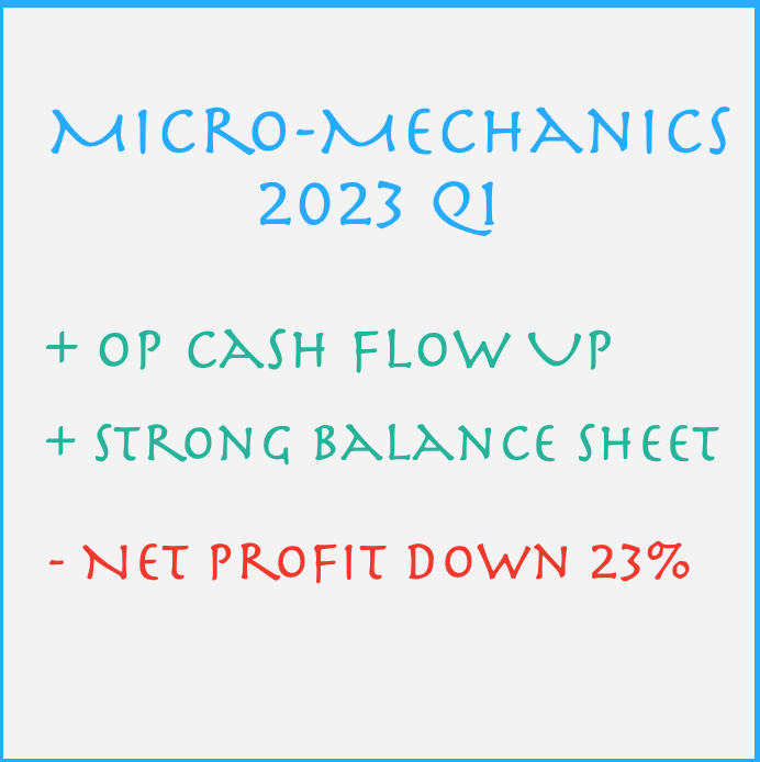 Micro-Mechanics reported a slightly lower revenue but its net profit dropped by 23%. The large drop in net profit can be attributed to the increase in cost sale. Demand remains healthy from ASEAN and US but there is a large drop in China’s market. The group attributed that to inflated demand for last year’s Q1.