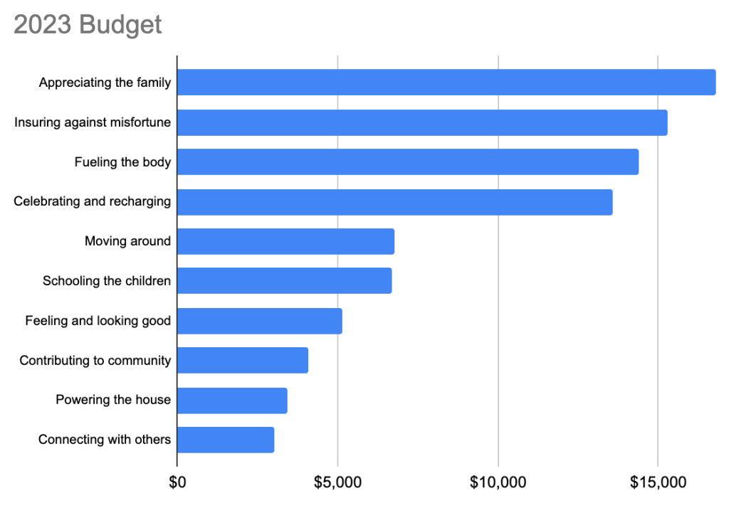 The following image shows the annual budget for the upcoming year in descending order. In total, it adds up to about 90k! That’s even higher than last year’s expenses after excluding car loan. A few exceptions this year include cost for daughter’s braces and possibly overseas vacation. Also, it might end up lower if less is spent on household maintenance and mobile devices.
