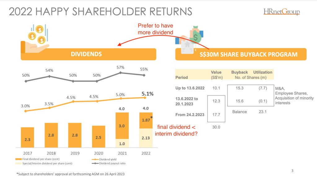 Being a relative new listed company, I think they are still experiencing how they reward shareholders. After only declaring final dividend for 2017 to 2020, an interim dividend was declared for FY2021 Q3. Then for FY2022, the interim dividend was declared for 1H results and it ends up that this is higher than the proposed final dividend. Coming from a shareholder’s perspective, it’s a bit confusing for me as it differs from my experience with other listed companies. This is generally what I experienced with other companies: