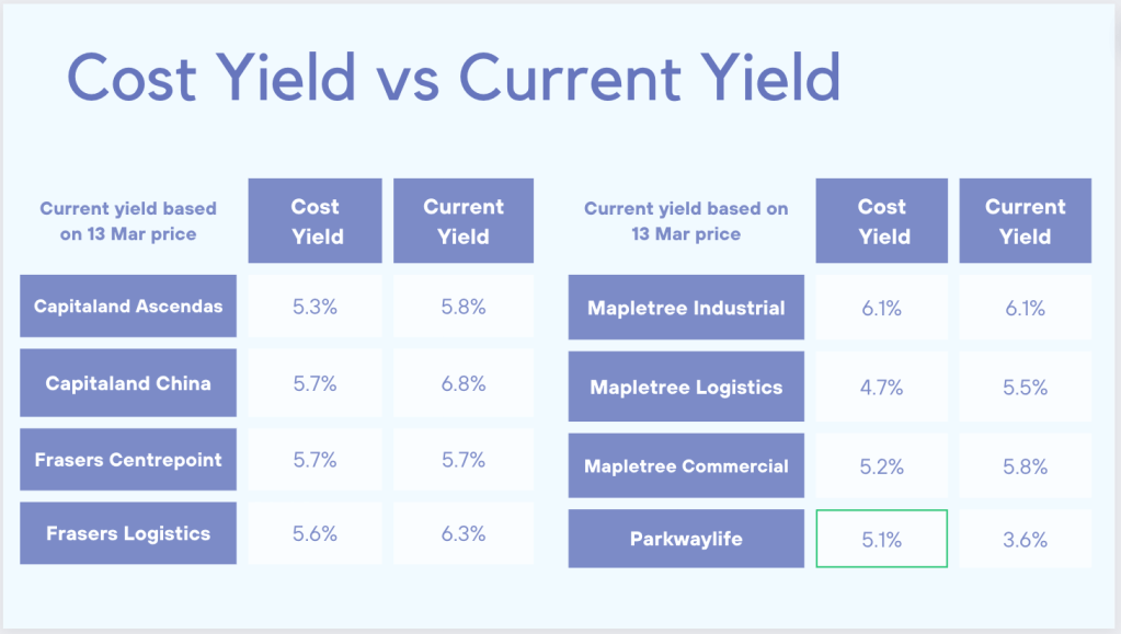With the exception of Parkwaylife, my cost yield is the same of lower than the current yield. Again, this shows how much Reits have lost favour over the past two years. Despite this, I still think there is a place for REITs in my portfolio. At the time of writing, they occupy about 32% of my equities portfolio which is within my planned allocation range.