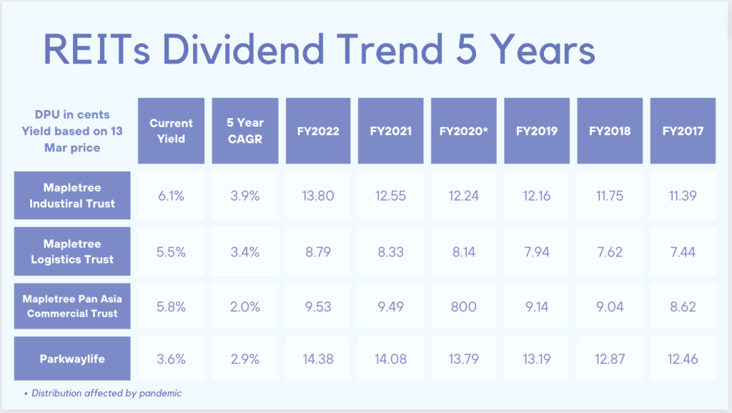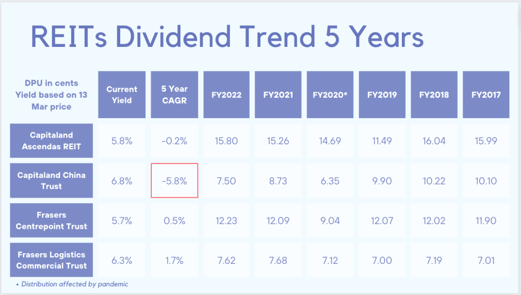 Decided to complete the series by looking at the 5 years dividend trend of the REITs that I hold. You can read the first two parts of this series on my income and growth counters at the following links.