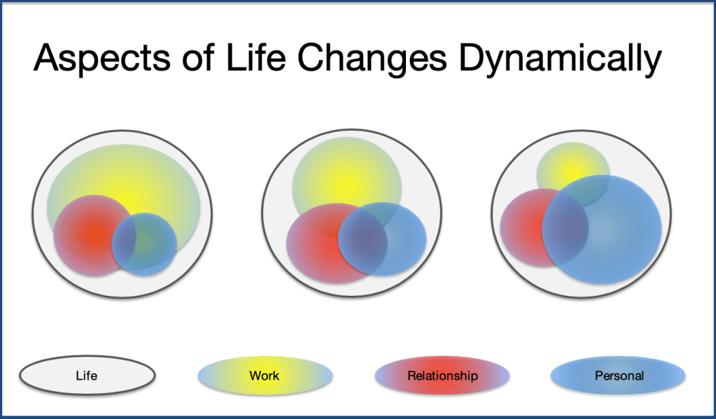 I do not like the term work-life balance as again the word “balance” suggests a mid-point which I do not think it is such. A former boss said this, “Work is a subset of life.” I am with this view. Two other big aspects in my life would be relationships and personal well being. Each aspect can branch out further to finer details. The three aspects are related to each other but I don’t see it like the famous purpose Venn diagram that is often misconstrued as Ikigai.