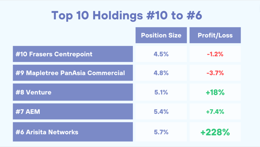I decided to do a Top 10 for my portfolio too. It is slightly more than 3 years now since the portfolio was incepted in January 2020. Lots of buy and sell in the first 2 years as I tried out different things with my portfolio but it has more or less stabilised over the past year. Without further ado, let’s start with number 10 to number 6 holdings.
