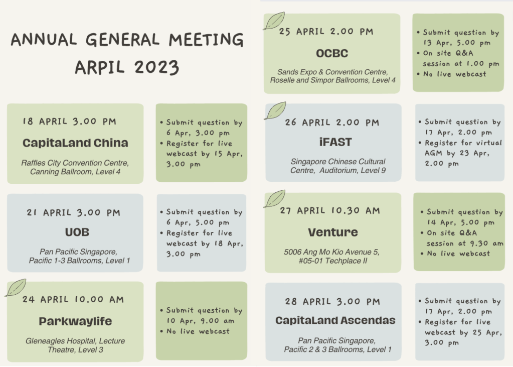 Do note the various deadlines if you want to attend/watch the AGM or asks questions. By the time I came out with this, the deadline to submit questions from CapitaLand China Trust and UOB has passed. And there will be no asking of questions or voting during live webcast. The exception are iFAST and Sheng Siong which will be conducting virtual AGM.
