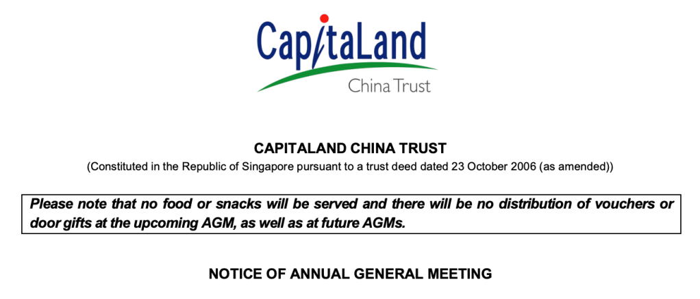 Also, if you have not realised, CapitaLand is doing away with serving of food and door gifts. No doubt this is not what I am gunning for when attending an AGM, I thought it is quite sad that they do away with it. AGM is the few occasions which the shareholders can meet up with the management, so I see it as a nice opportunity to build goodwill.