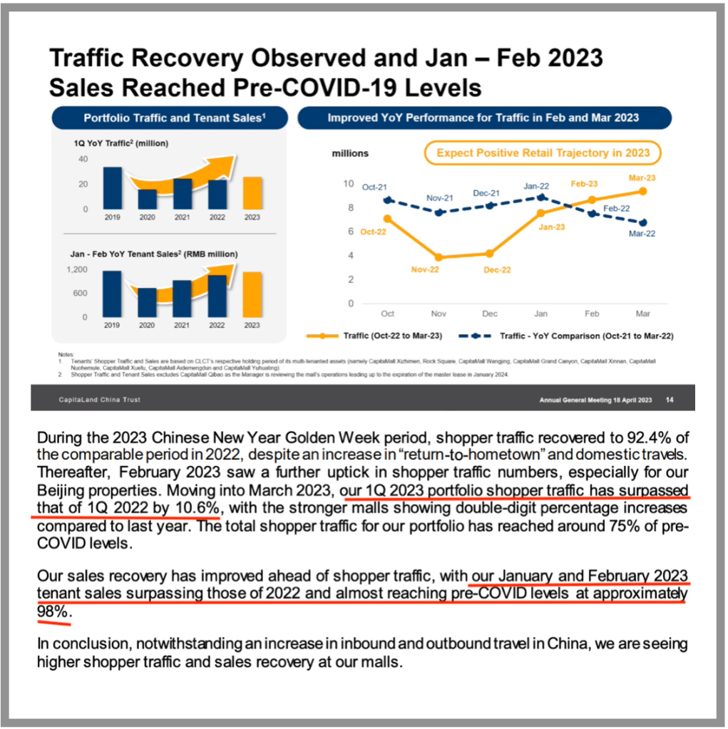 I did not go to the AGM but watched the live broadcast. Attendance looked good even though no voucher or food for CapitaLand AGM from this year onwards. CEO Tan Tze Wooi gave a presentation before the formal AGM. In short, AEI at major malls have resulted in positive rental reversion. Also, Q1 2023 traffic is already higher than that of 2022, with tenant sales at approximately 98% of pre-covid level! That’s pretty impressive.