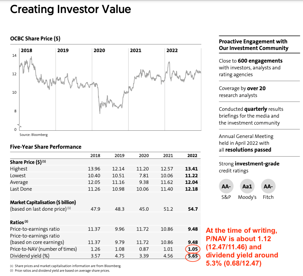 OCBC has always been valued lower as compared to UOB and DBS. It could be their size or relatively weaker performance in previous years. With a strong showing for FY2022, the latest metric shows that it is currently valued lower than its past 5 years (excluding 2020) average.