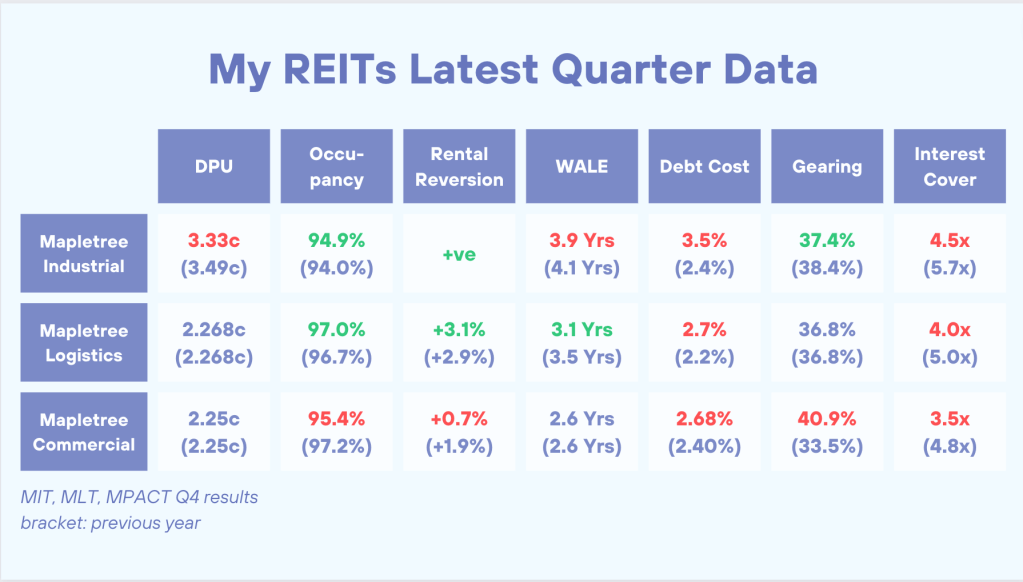 Given the tough macro conditions, the REITs in my portfolio have shown resilient and done well. With the relent increase in interest rate over the past year, cost of debt has definitely impacted the performance. If you have a rental property with mortgage, you would have felt the same impact on your debt and probably thinking how to get more rent to mitigate the increase in debt cost. So for REITs that have maintained or just have a slight dip in their DPU, it is a commendable performance.