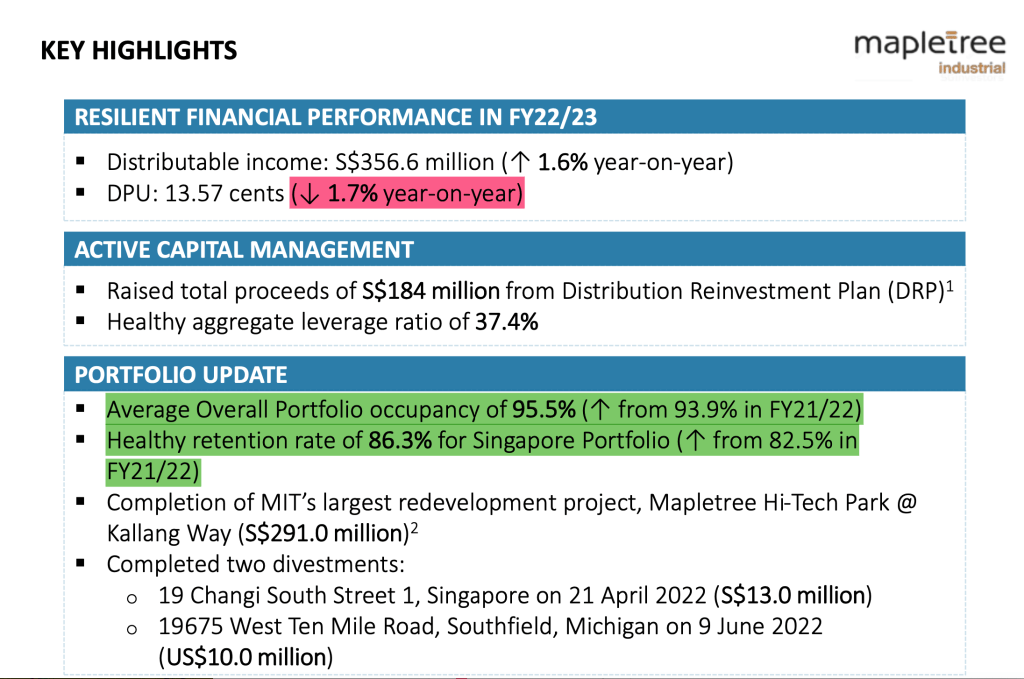 Amid the quick increase in interest rate over the past year, I think it is a credible performance by the REIT to just have its DPU dropped by 1.7% only. They have increased the occupancy and improve the retention rate. While this is partly achieved with a lower rental, it was a deliberate trade off which makes sense to me.