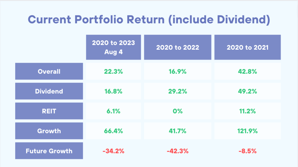Also, notice the volatility in the growth counters. Yes, one might still say 42% return is still a good return over a 3-year period but imagine if this portfolio was incepted at end of 2021 with only growth counters, then the return for 2022 would be devastating.