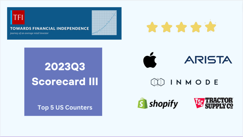 In short, I am pleased with the performance. Arista Networks and Inmode continue to impress me with their performance. Apple’s growth might seem to have stalled but it’s still much higher than pre-pandemic level. With a large installed base and continued growth in service, they might still surprise us going forward. Shopify in free cashflow positive for 3 consecutive quarters. With the recent selling of logistics segment, harder to make sense of their number but still confident of its long term growth. Finally, Tractor Supply facing some headwind now but still growing. Not sure how its real estate strategy will pan out.