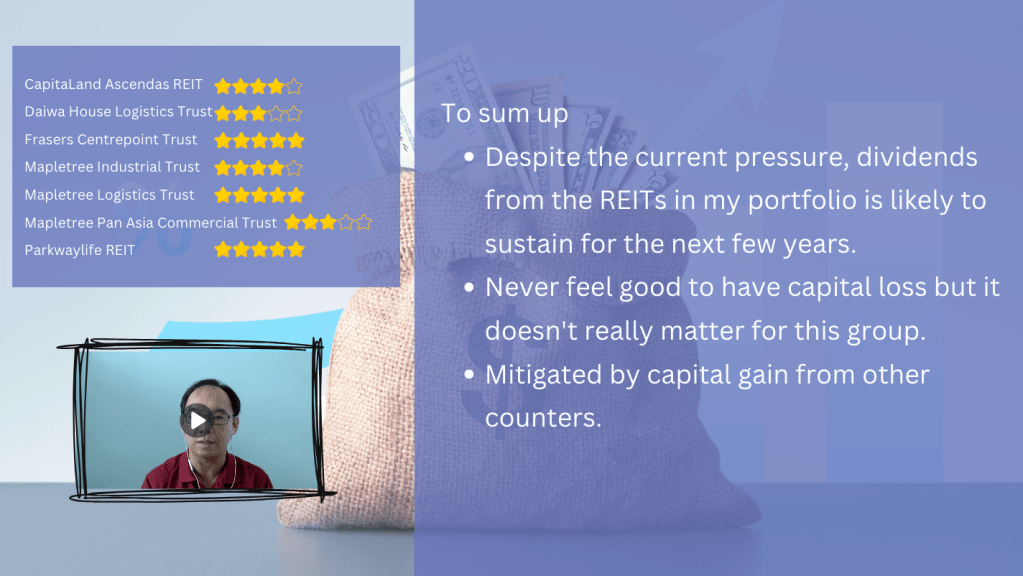 In short, I am confident that the dividends from the REITs in my portfolio is likely to sustain for the next few years. While it never feels good to have capital loss (even for unrealised), it really does not matter if the intent of this investment is for future income.