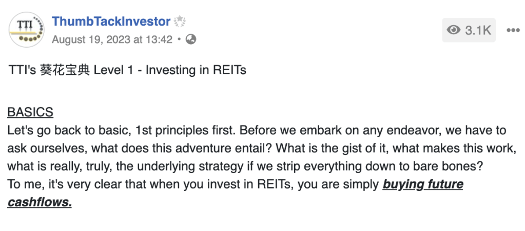 While he was referring to REITs (which he does not invest in as he is in another investing realm), the same can be applied to income investing. When we invest for income, we are buying future cashflow to fund our expenses. So long as the REITs or companies can sustain the payout, then the share price which is a function of a lot more variables, does not really matter.