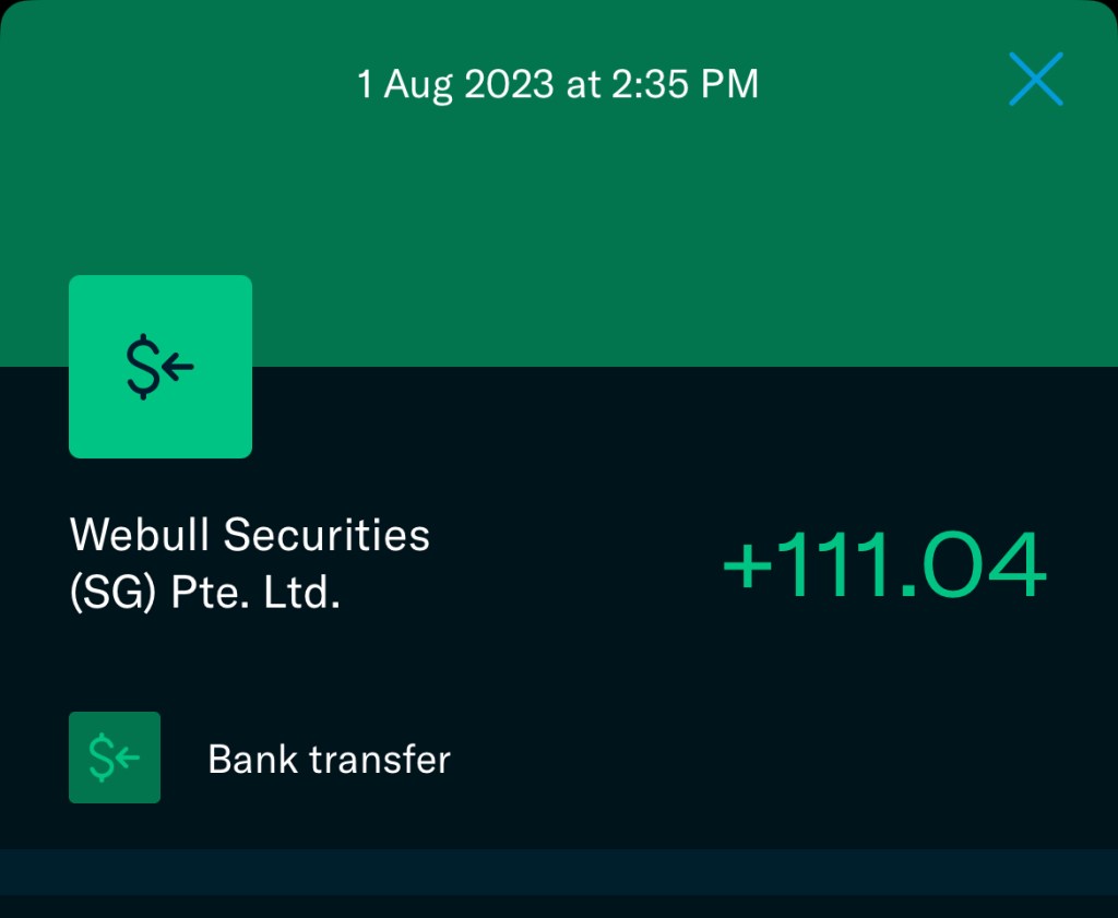 Back in April, I took part Webull fund ANY amount promotion and received 5 fractional shares of TSLA worth US$50. Luckily for me, TSLA shares appreciated and I finally cashed it out last month, receiving $110 in return. Not bad for simply opening an account and funding $1.