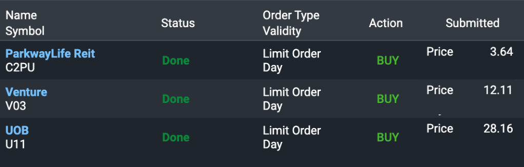 The price continued to increase along the week before dropping on Friday. This morning, the price continues to weaken and is back to the level that I had wanted to buy initially. So I decided to press the buy button and I could even squeeze in a lot of ParkwayLife REIT.