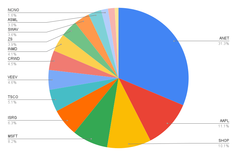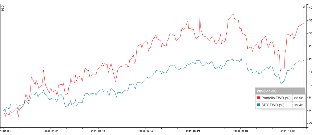 Looking at the overall portfolio performance, it has been a strong year. Year to date, it is up by 34% as compared to SPY’s 19%. A few notable counters that have shored up the portfolio are ANET (+72%), SHOP (+99%), AAPL (+47%) and MSFT (+57%).