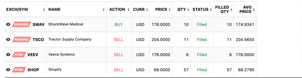 As for TSCO and VEEV, the adjustments are more cosmetics than anything else. With the sales proceed, I decided to add more to SWAV. It was sold down by the market due to the uncertainty of insurance payment on one of its products. I think that will weigh on it in the near future but longer term, it should be a non issue.