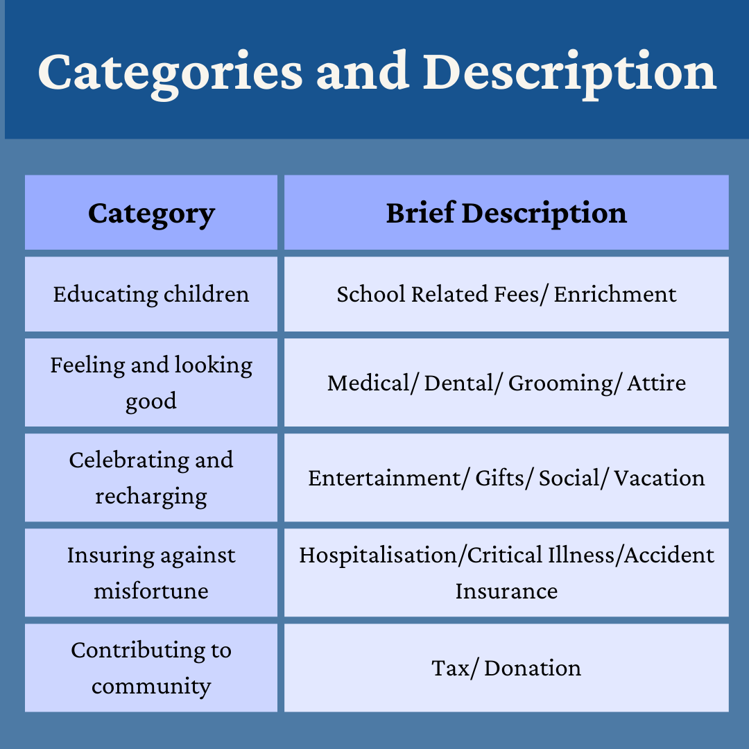 Money is the means, not the end. It is important therefore to ask ourselves what are we saving or using the money for? With that in mind, I renamed the expenses categories during the year, so that they are meaningful to me.