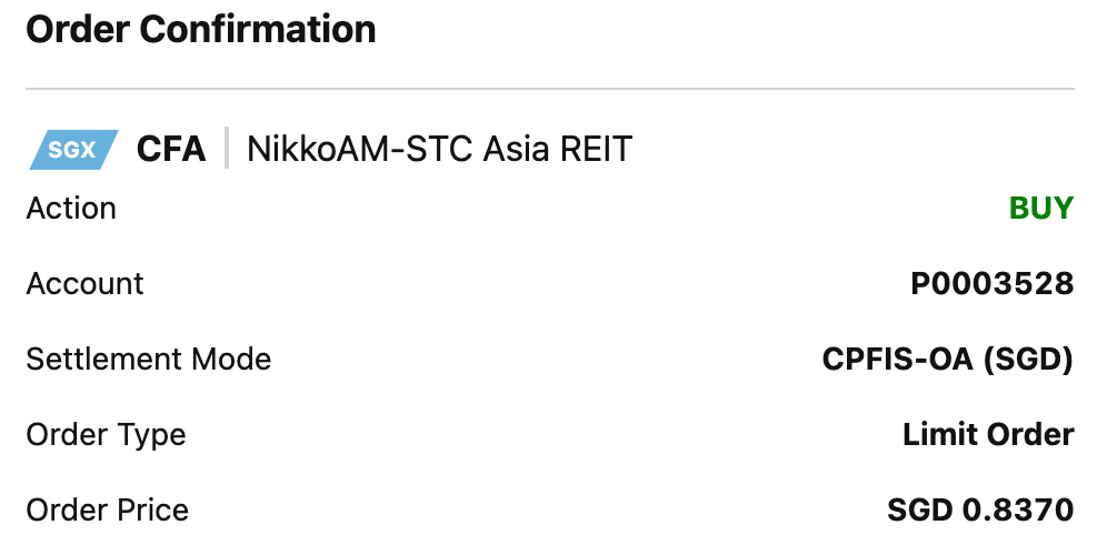 Nonetheless, if it can maintain its DPU, that still gives a yield of 6.1%. Pretty decent over CPF-OA 2.5% or T-bill high 3%. The only reason I am adding this and not other REITs counters is because I am only left with CPF that I can utilise for stock purchase.