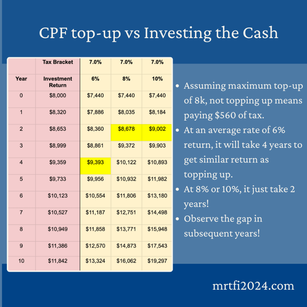 As shown in the above computation, for a $8k top up and 7% tax rate, one will save about $560. If one can achieve an average return of 6%, it requires 4 years to earn back this relief. Up the return to 8%, it requires only 2 years to earn back the tax relief!