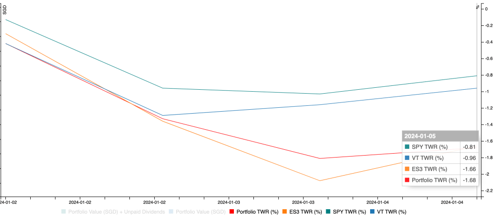 The market has not continued with the momentum from the last two weeks of 2023. At the end of first week, ES3 is down by 1.7% and SPY is down by 0.8%. Since I am not into shorting and do not use options, my portfolio in general tracks the market movement, and is down 1.7% for the first week.