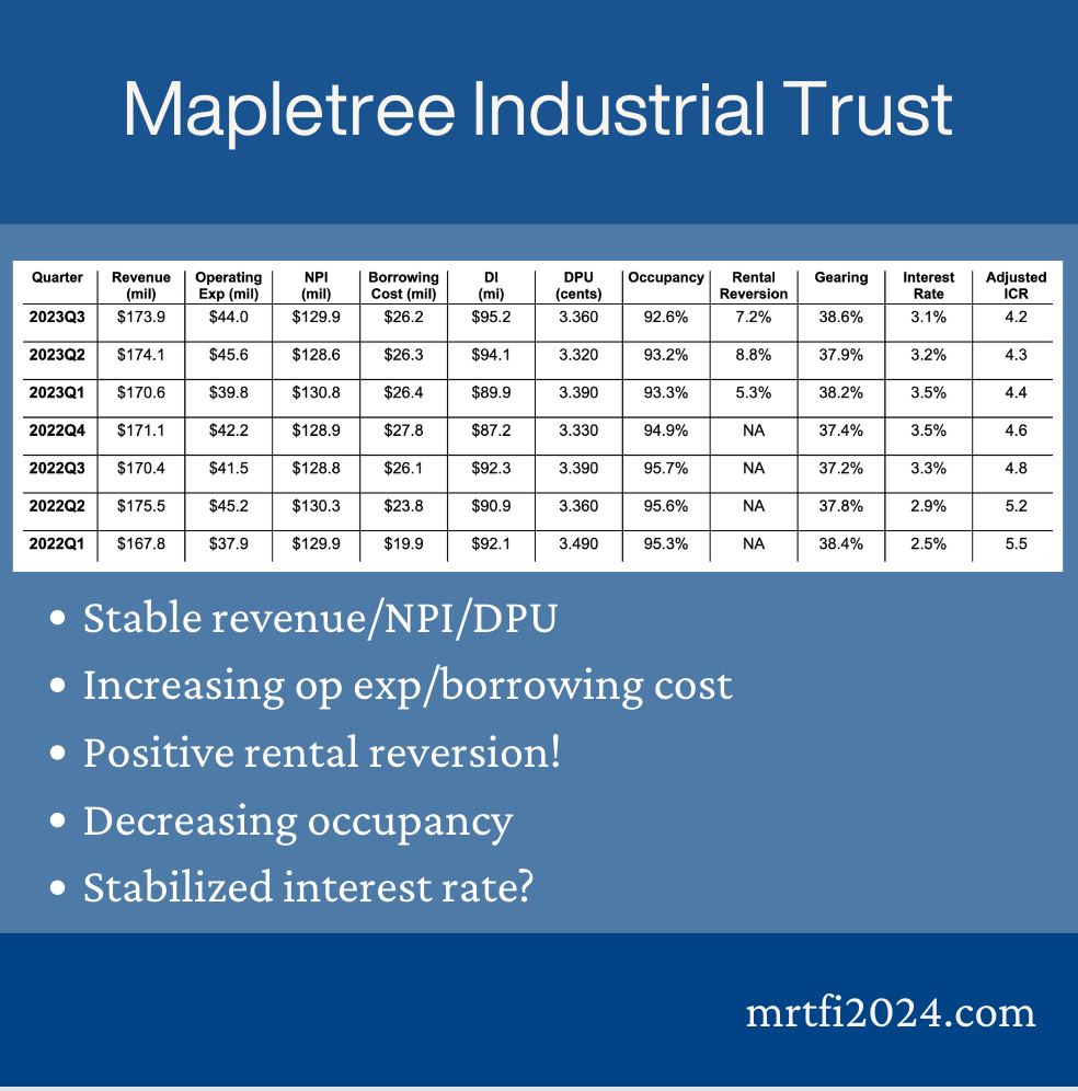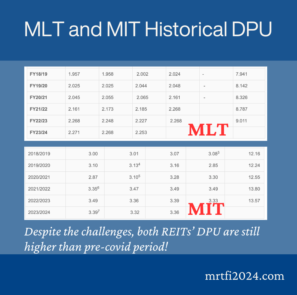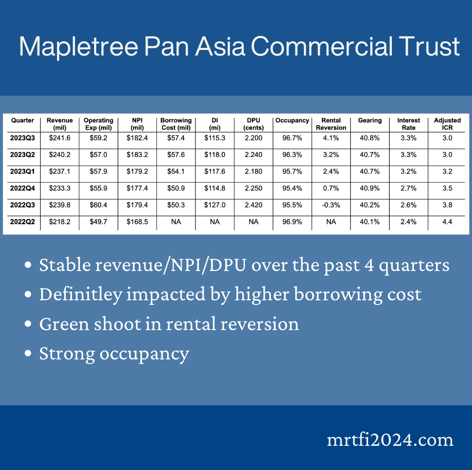 For MPACT, I am just going to look at its performance after merger. They are definitely impacted by the jump in borrowing cost. However, with the improved occupancy and positive rental reversion, distributable income and DPU are rather stable over the past 4 quarters.