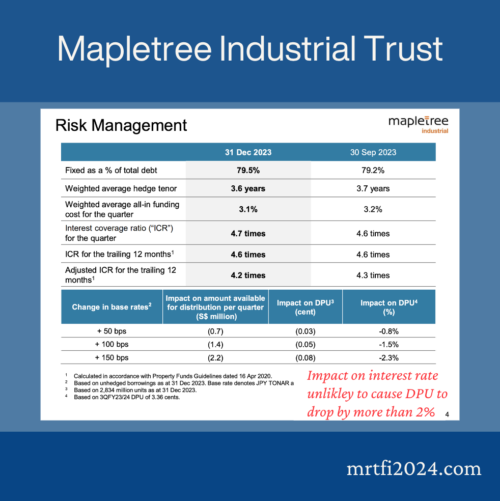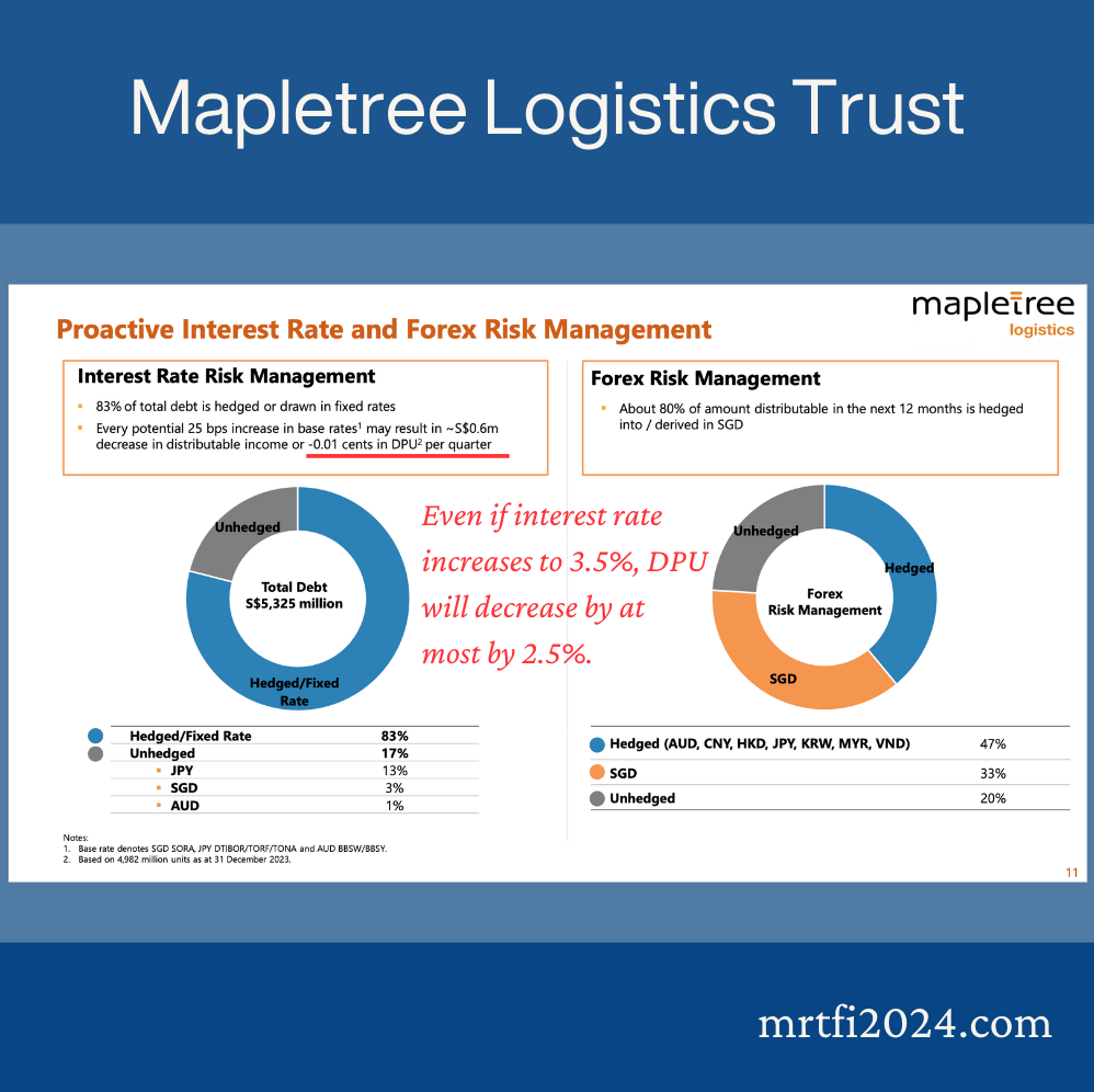 Also, they have guided every 25 bps increase, DPU will only drop by about 0.01 cent per quarter. So assuming the interest rate increases to 3.5%, then DPU will drop by around 0.04 to 0.05 cents, and that is less than a 2.5% drop from the latest amount.