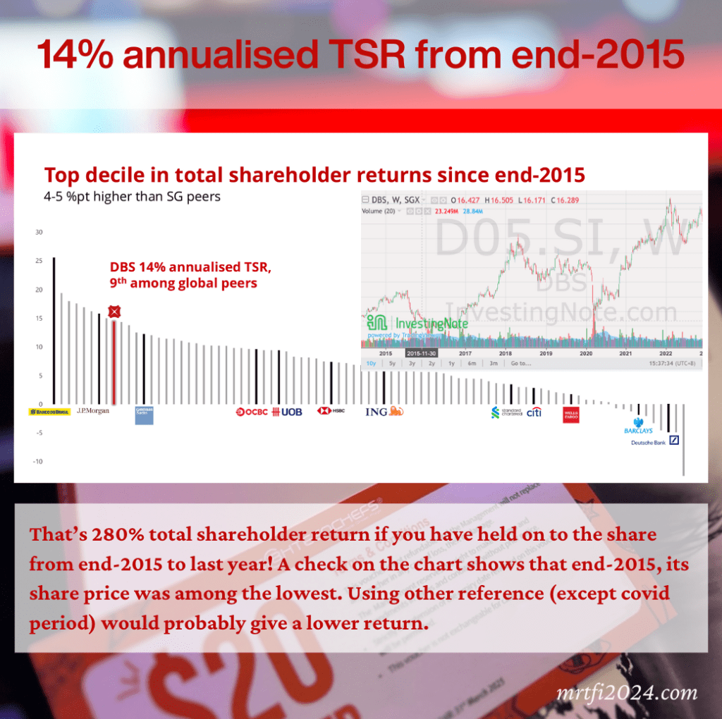 Another interesting share is the total shareholders’ return over the past eight years. If one has held on to DBS shares from end 2015 to now, that would a total of 280% return! Impressive indeed but I am always wary of such comparison as a change in reference date would result in a different number. And indeed, a check on the chart shows that during the period of end 2015 to early 2016, DBS was trading only at around $16. If a different reference (excluding Covid period) is used, then the return would probably still be good but not as impressive.
