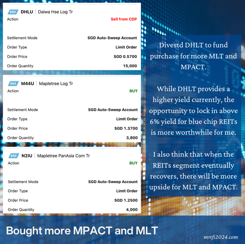 To fund the above purchases, I decided to switch out from Daiwa House Logistics Trust (DHLT). While DHLT offers a higher yield at the moment, I reckon the opportunity to lock in above 6% yield from these two blue chip REITS is more worthwhile.