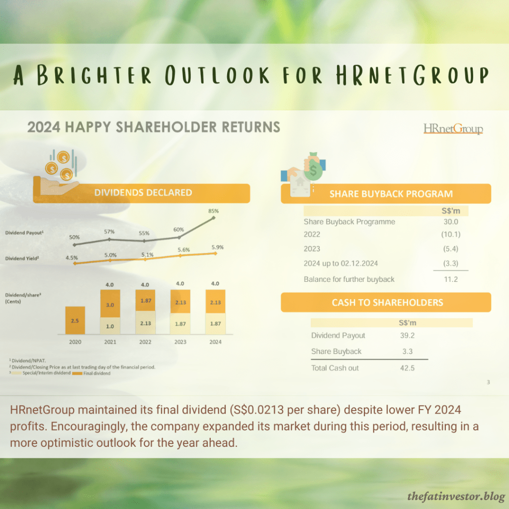 Notably, HRnetGroup maintained its final dividend at S$0.0213 per share, bringing the total dividend to S$0.04. This consistent dividend payout, even without a formal fixed dividend policy, underscores management’s commitment to shareholder returns.
