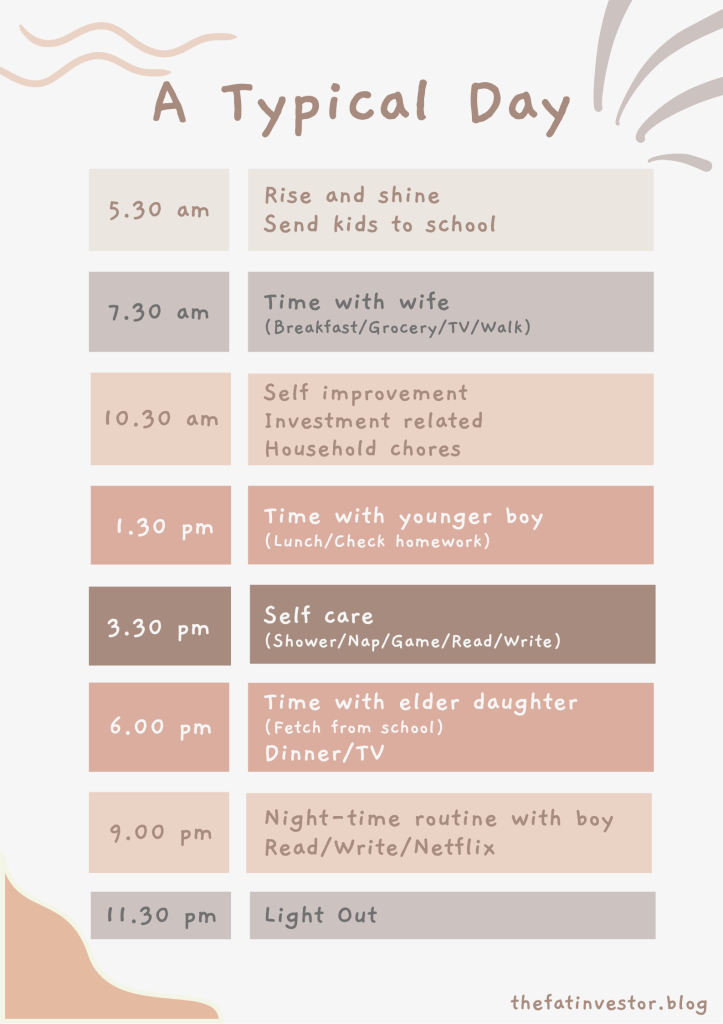 As you can see from the above schedule, my typical day is pretty mundane, simply revolves around my family, investments, learning, and passive leisure.