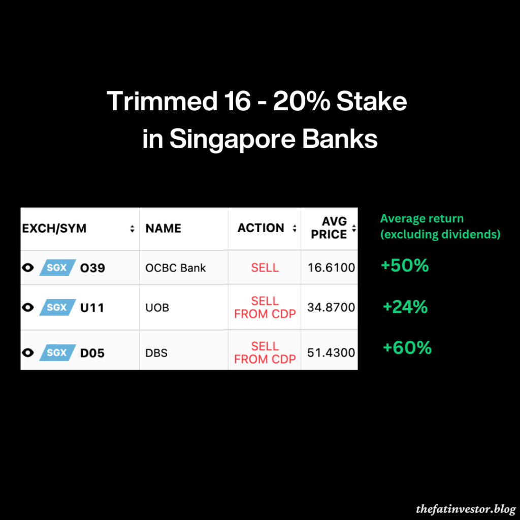 Moving on to something totally unrelated: I trimmed about 16-20% of my stakes in the three Singapore’s leading banks DBS Group (SGX: D05), OCBC Ltd (SGX: O39), and United Overseas Bank Ltd (SGX: U11) on Thursday.