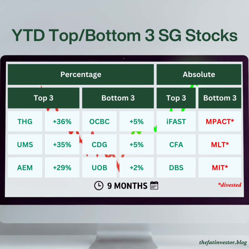 Besides the realised loss from the divestment of the three Mapletree S-REITs, even my bottom 3 performers are in the green!