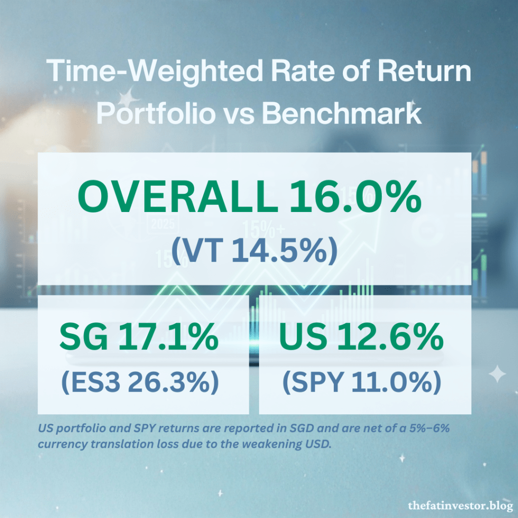 You’ll realise it’s far more sensible for me to celebrate the SG portfolio. Even though it “lost” the race against its benchmark, it contributed more to my net worth than the “victorious” US side.