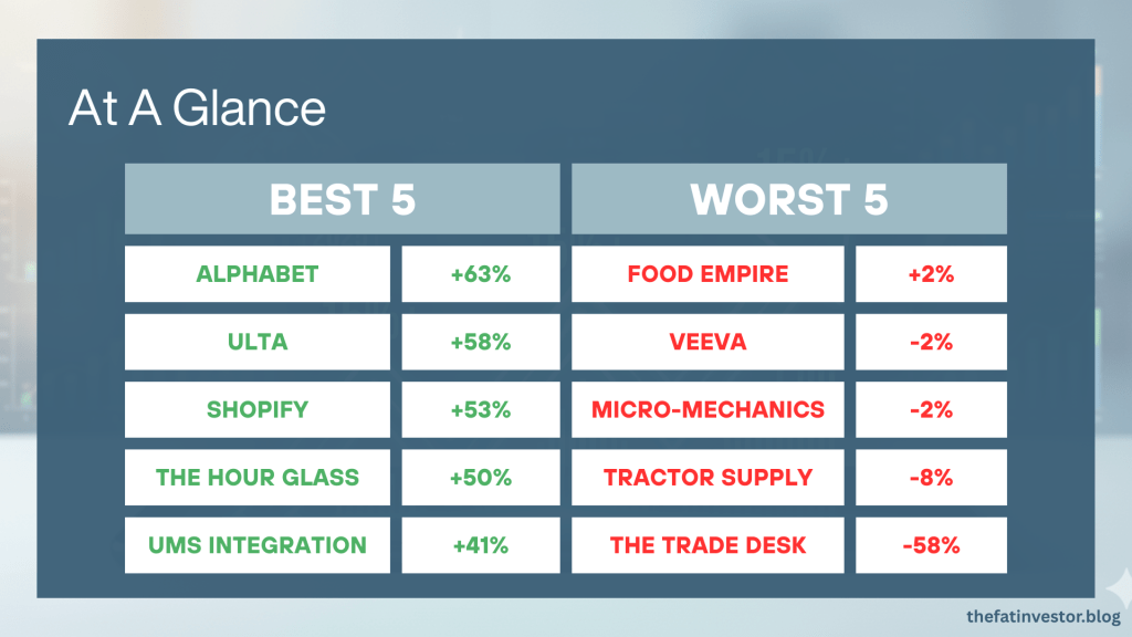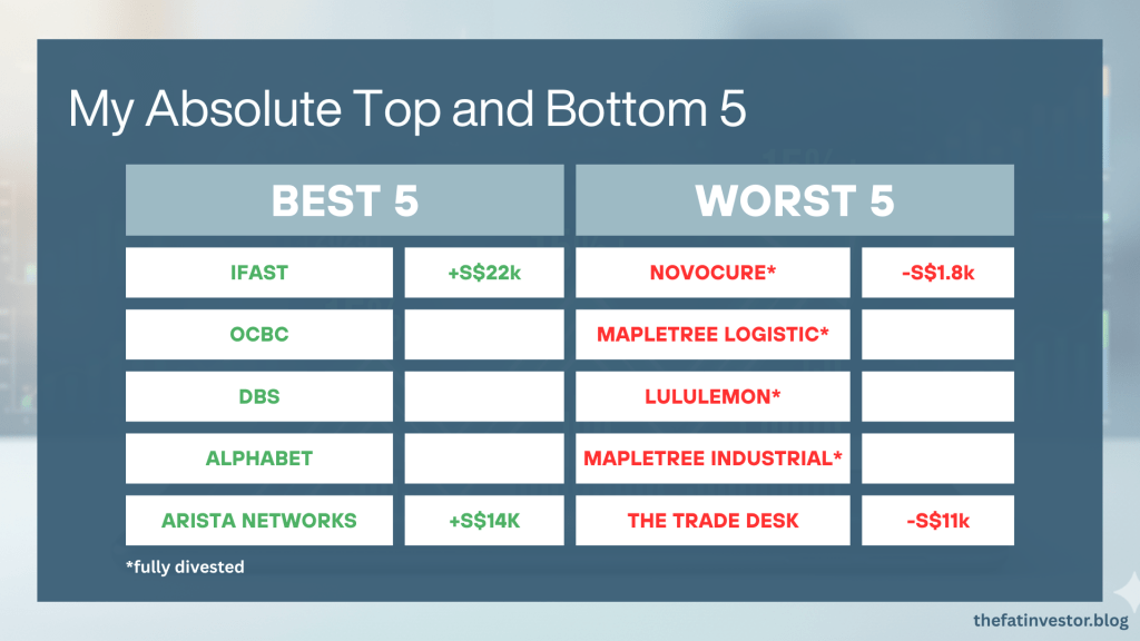 Stocks like iFAST (AIY), OCBC (O39), and Arista Networks (ANET) are among my top five largest positions. Their returns were solid (12% to 30%) but not “explosive” like Ulta’s 58%.